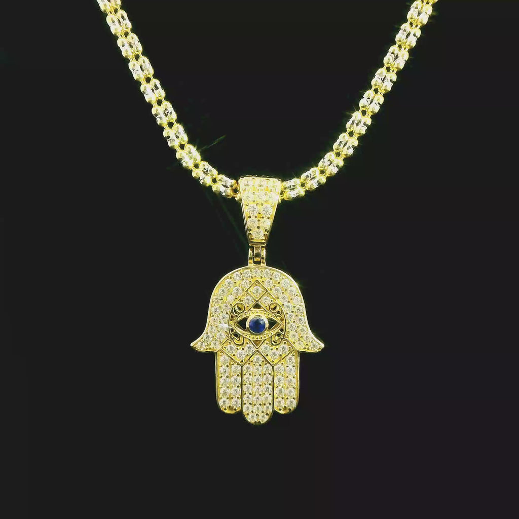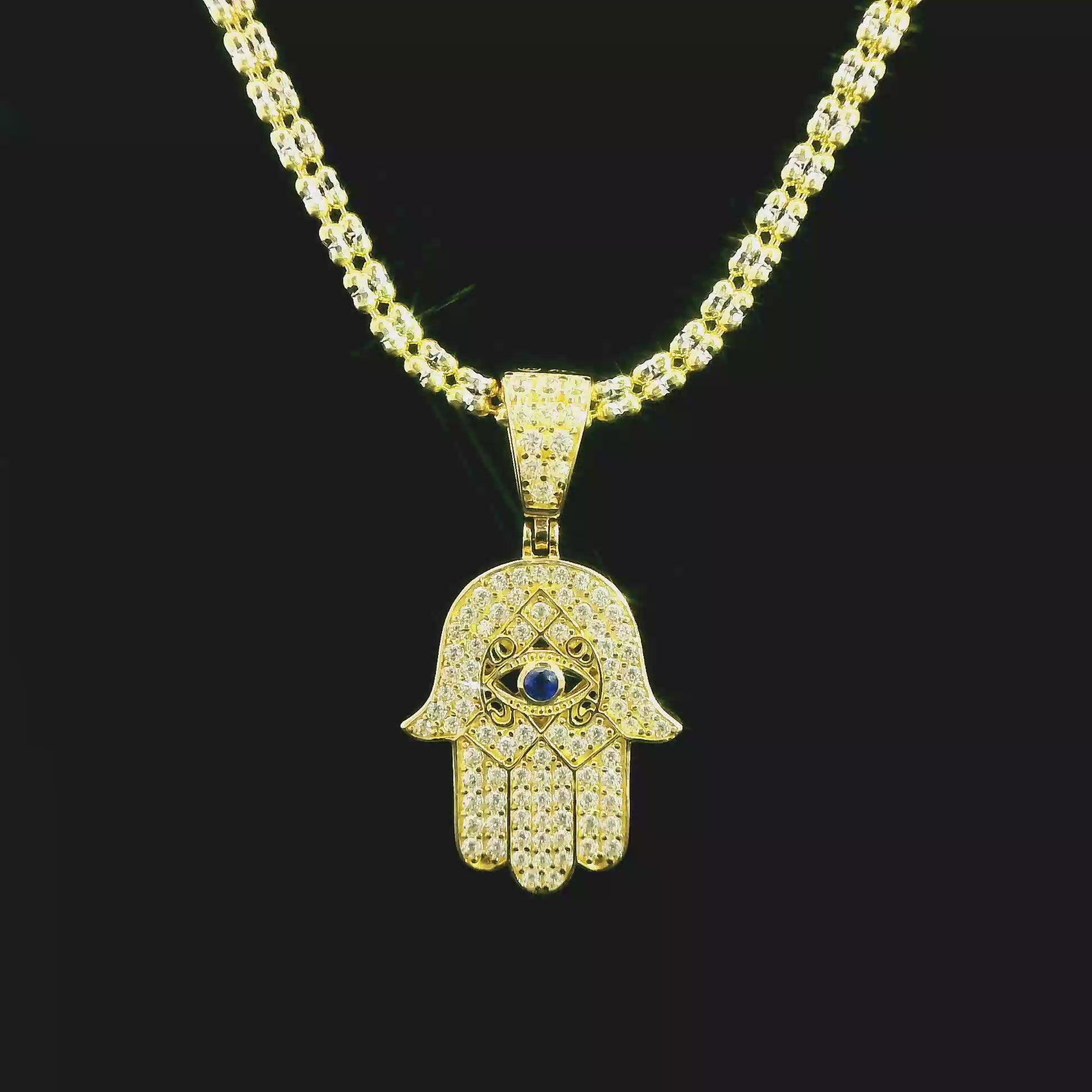 14K Hamsa 🪬 CZ Pendant W/ Moon Iced Chain (16” Inches) JTJ™