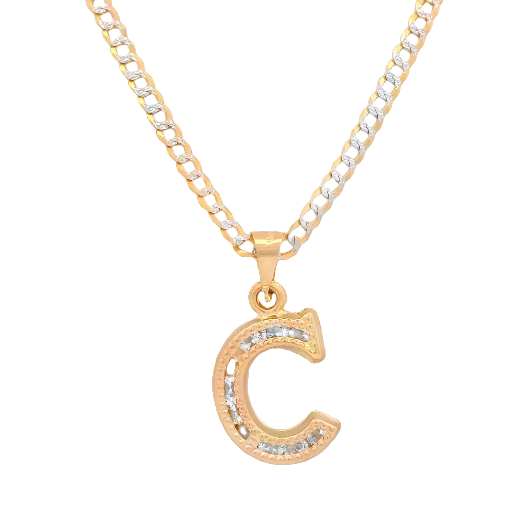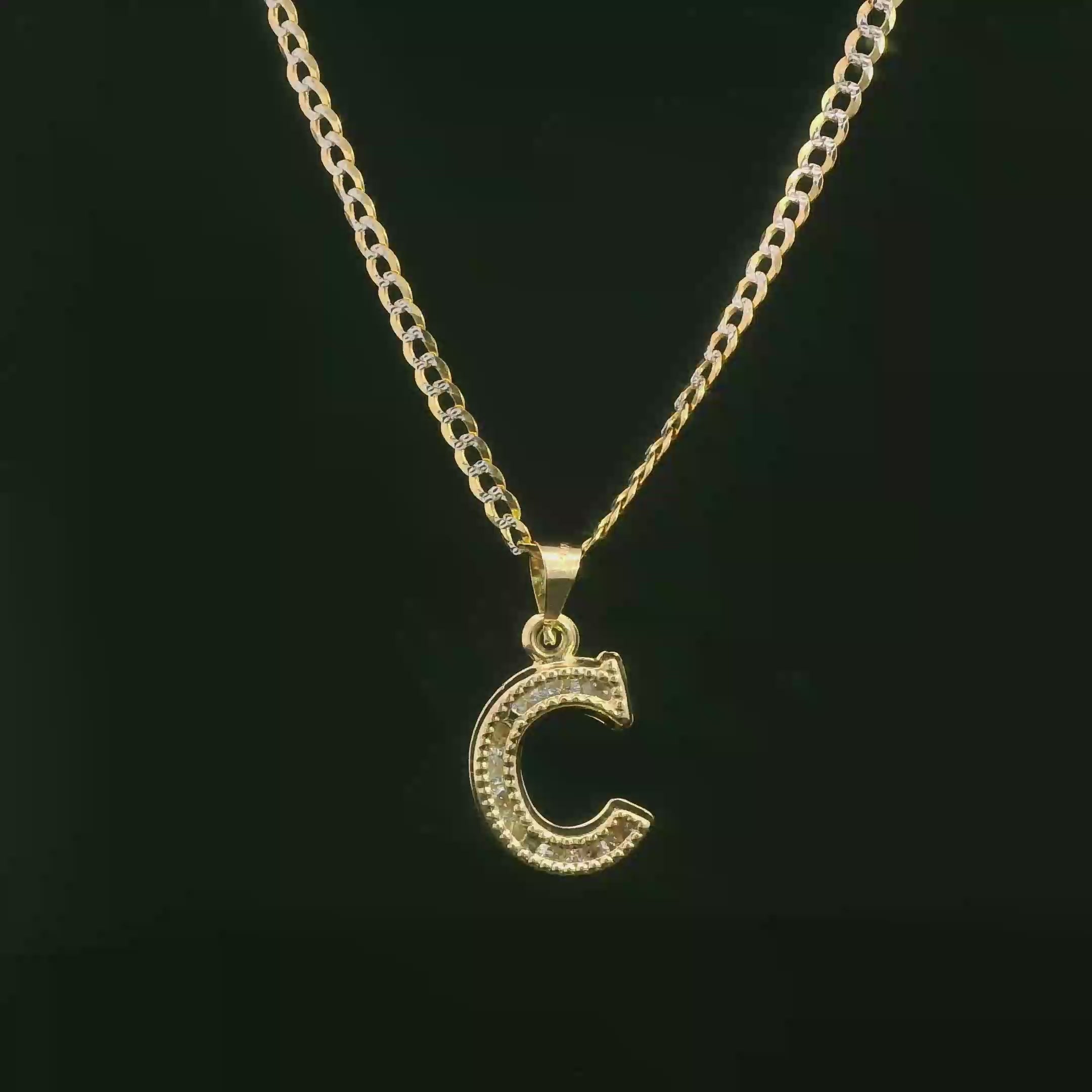 14K Initial (C) CZ Pendant w/ Solid Two Tone Cuban Chain (18” Inches) JTJ™