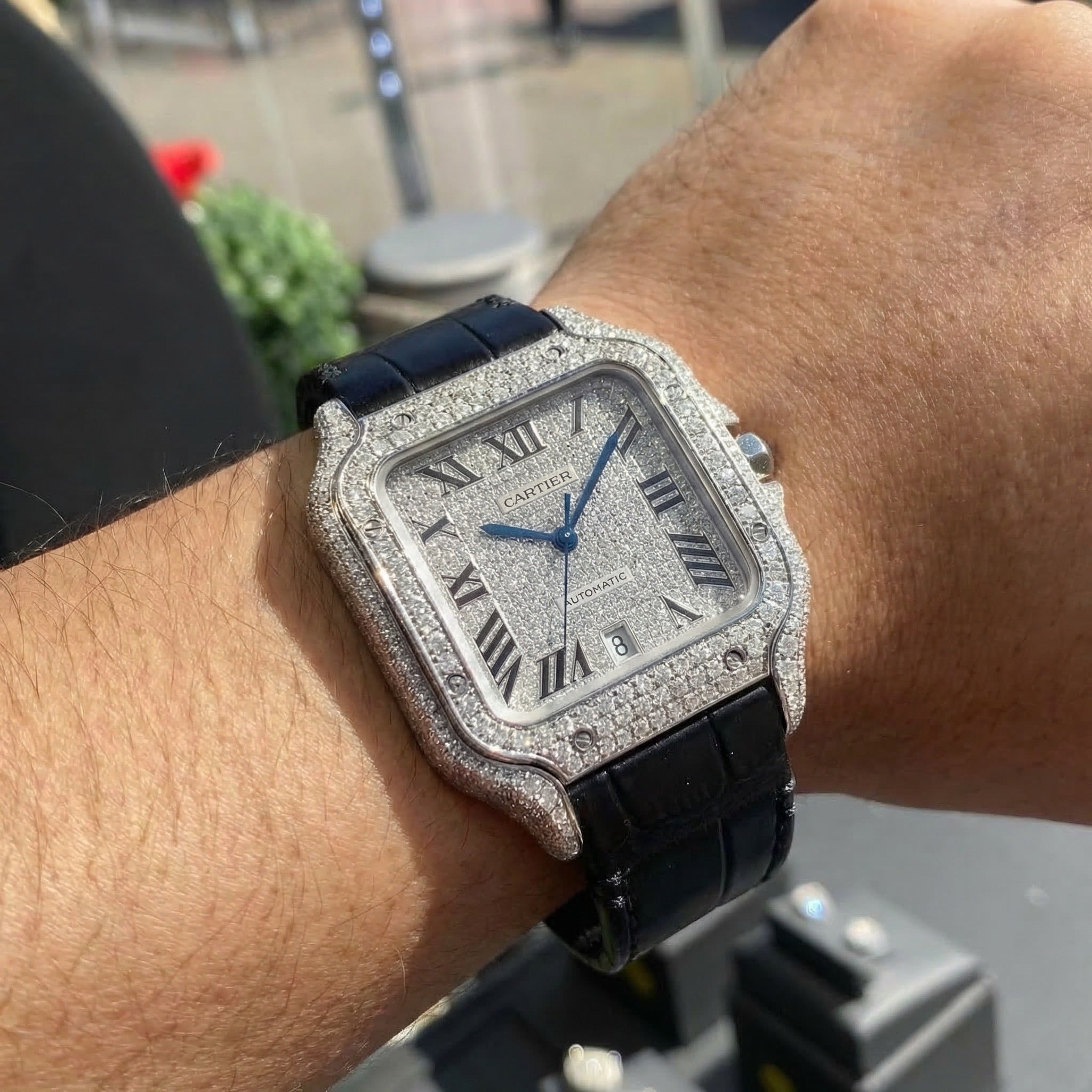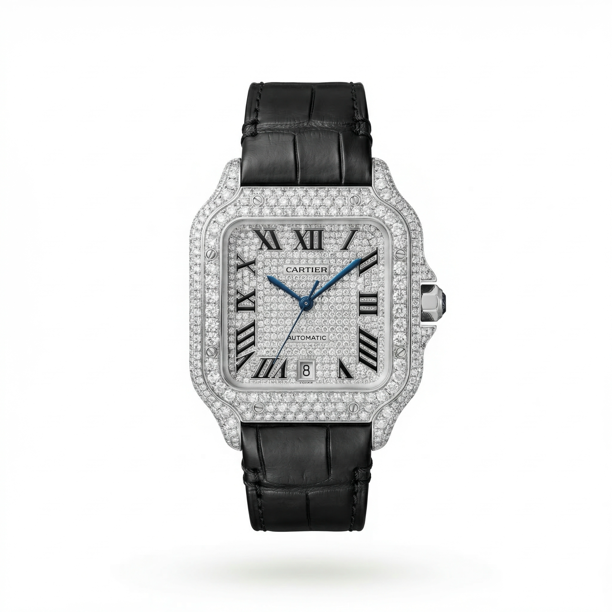 Cartier Santos XL Black Roman Iced Out Diamond Dial & Bezel 💎 Black Leather Strap JTJ™