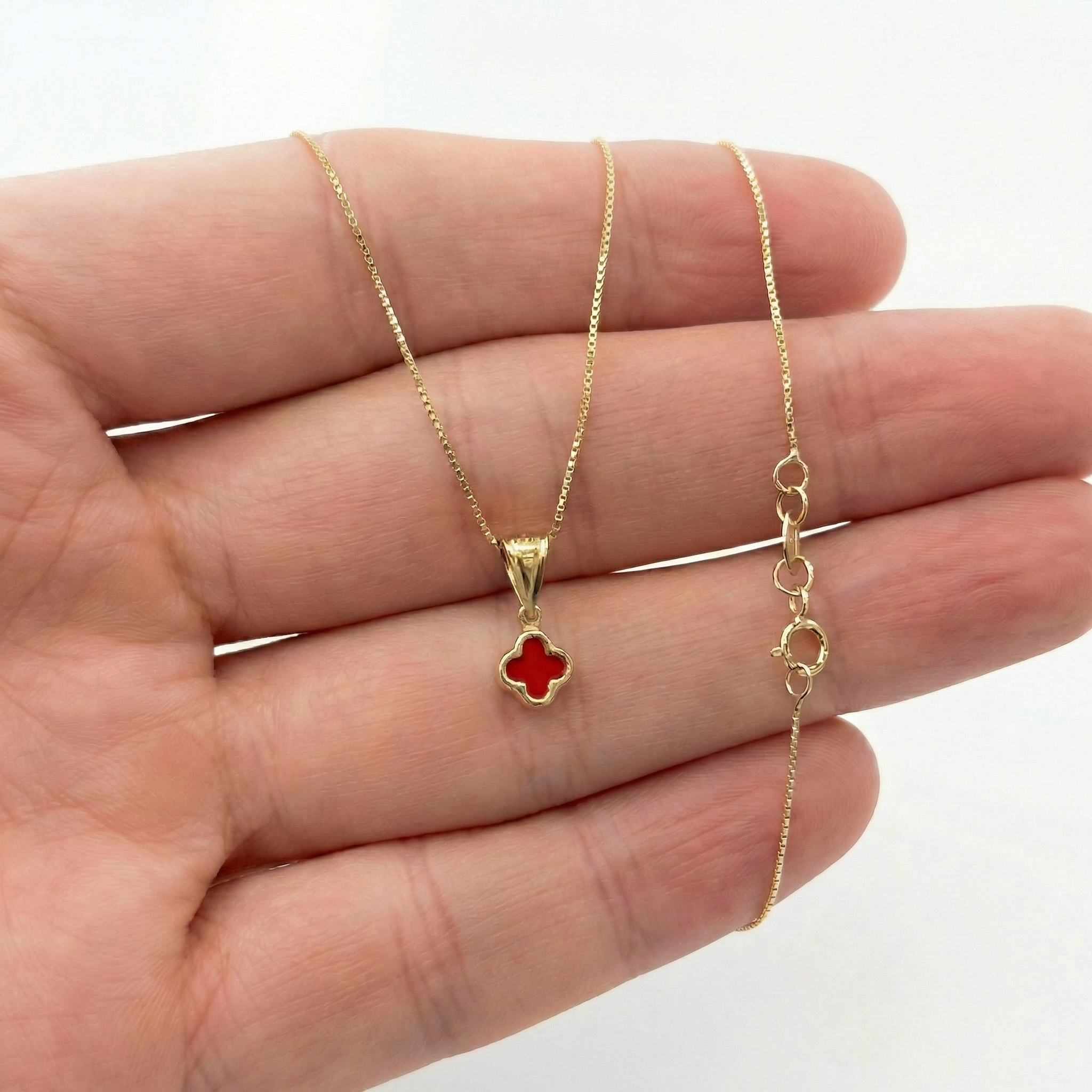 14 K Small Clover Red Pendant W/ Solid Box Chain (18” Inches) JTJ™
